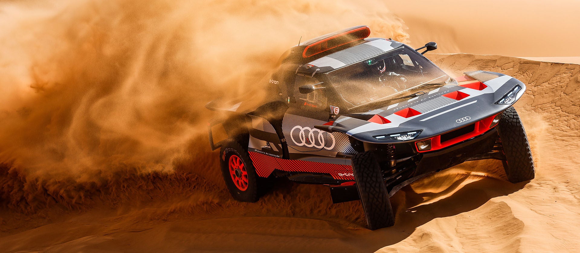 A Audi enfrenta um dos maiores desafios do automobilismo: a marca dos quatro anéis enfrenta o famoso Rally Dakar. O conceito de direção alternativa do Audi RS Q e-tron E2¹ combina uma transmissão elétrica com uma bateria de alta tensão e um conversor de energia² altamente eficiente. O Team Audi Sport fez uma estreia bem-sucedida na edição de 2022 do Rally Dakar e conquistou quatro vitórias em etapas e 14 pódios durante o evento de duas semanas em janeiro de 2022. O protótipo inovador apresenta-se significativamente melhorado para o Rally Dakar 2023 e ostenta agora a sigla E2, acompanhando a sua evolução durante a segunda fase do programa de desenvolvimento. O rali cross-countryé a ponta que lança o compromisso do automobilismode fábrica.<br/><br/><br/>¹Este veículo mostrado aqui é o veículo Rally Dakar que não está disponível como modelo de produção.<br/>²O Audi RS Q e-tron combina uma transmissão elétrica com um sistema conversor de energia baseado no motor TFSI e um gerador